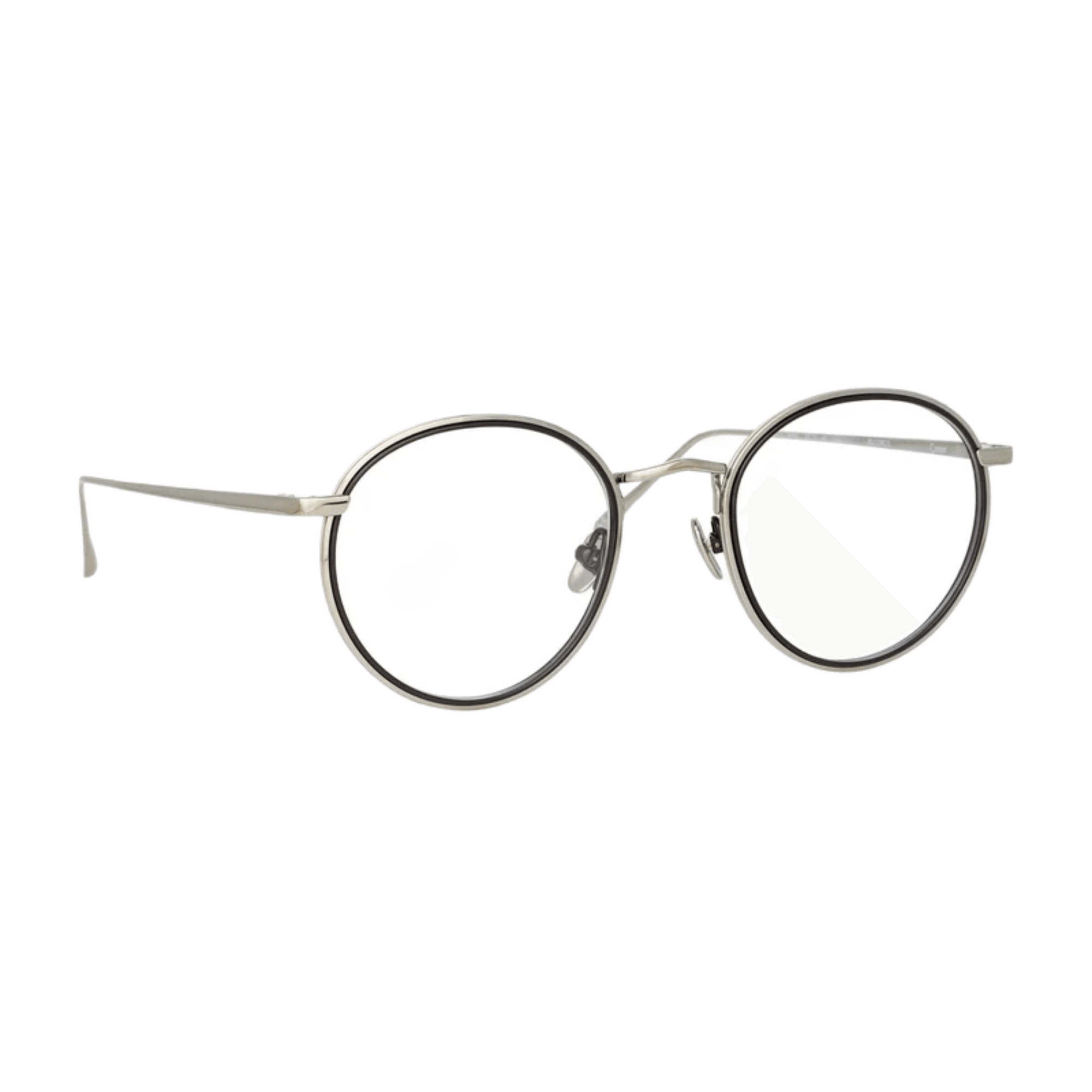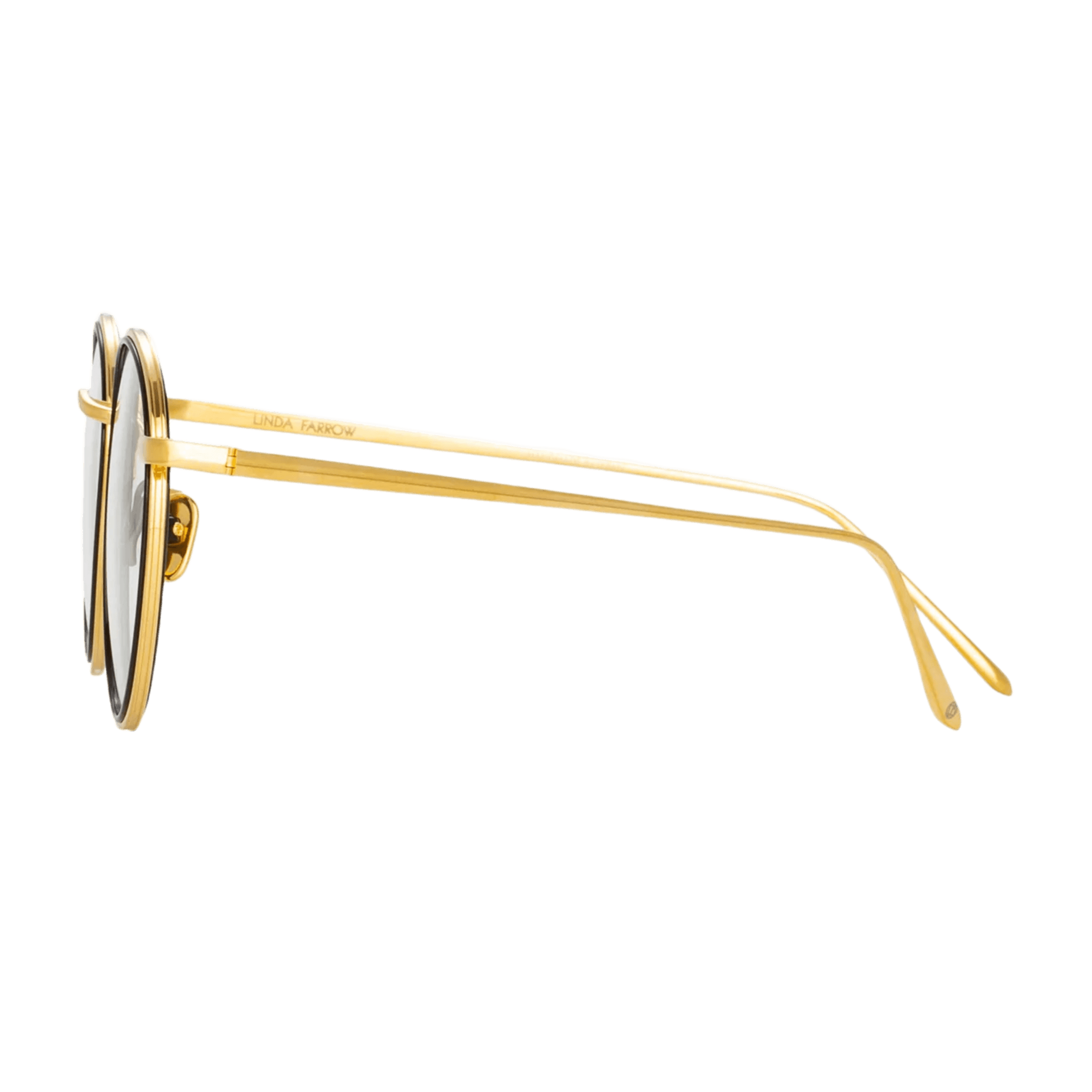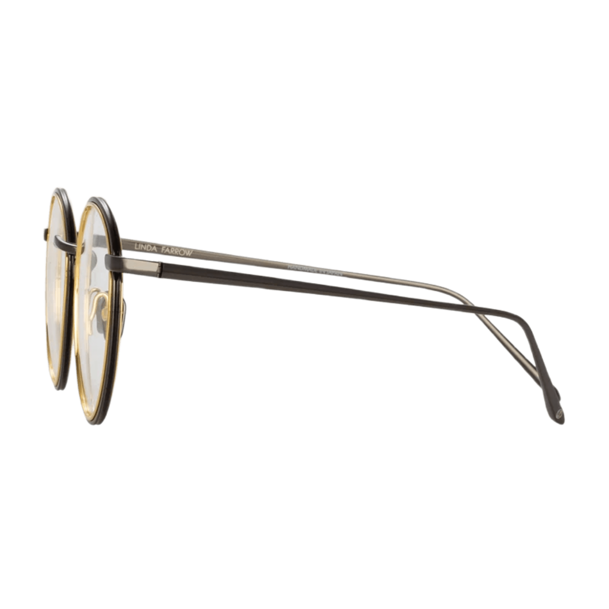 Delicate oval optical frames from the LINDA FARROW collection are crafted from fine titanium layered together, creating a striking contrast. The outer edge of the frame is pressed with step detailing, and it flows into the custom logo nose bridge.